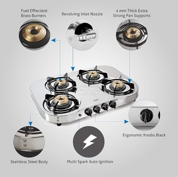 • ๐—ฃ๐—ฟ๐—ฒ๐—บ๐—ถ๐˜‚๐—บ ๐—•๐—ฟ๐—ฎ๐˜€๐˜€ ๐—•๐˜‚๐—ฟ๐—ป๐—ฒ๐—ฟ๐˜€: High-quality brass burners ensure efficient heat distribution and long-lasting performance, making cooking quicker and more consistent. specially designed for uniform heat across the cooking surface, reducing hotspots and ensuring perfectly cooked meals.