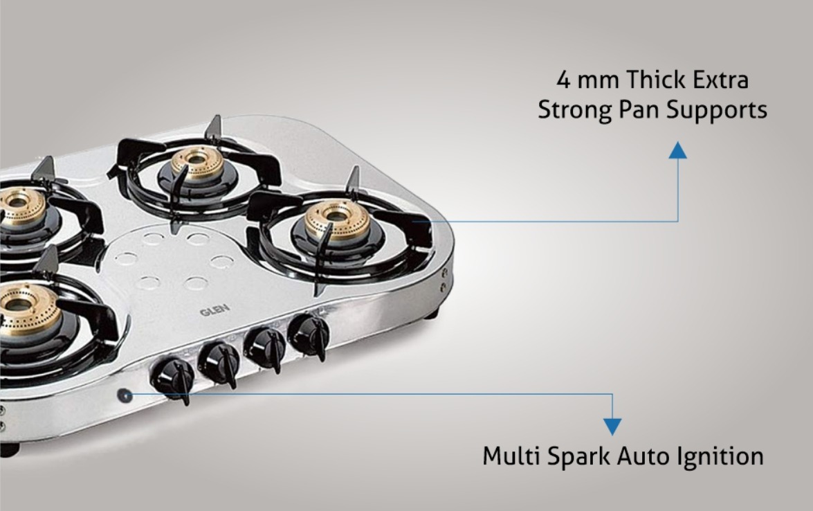 Stainless steel cooktops to suit the aesthetics of your conventional style kitchen. Features like fuel efficient brass burners, strong pan supports, multi spark auto ignition rich SS body and perfect flame control makes Glen an ideal partner for the well-being of you and your family.