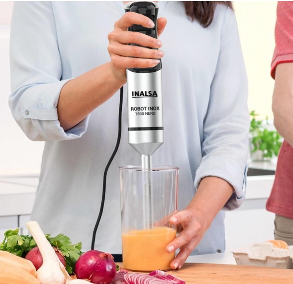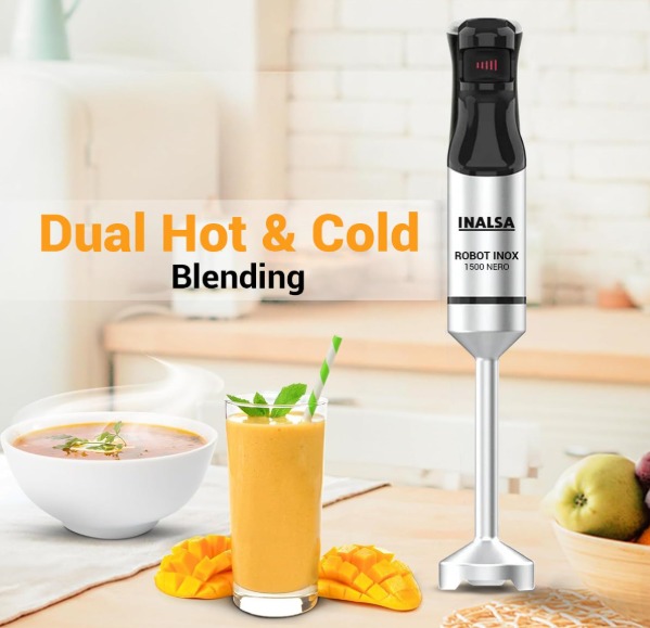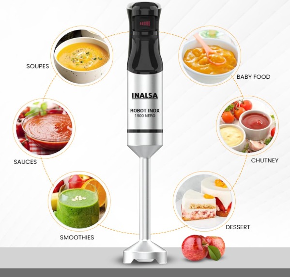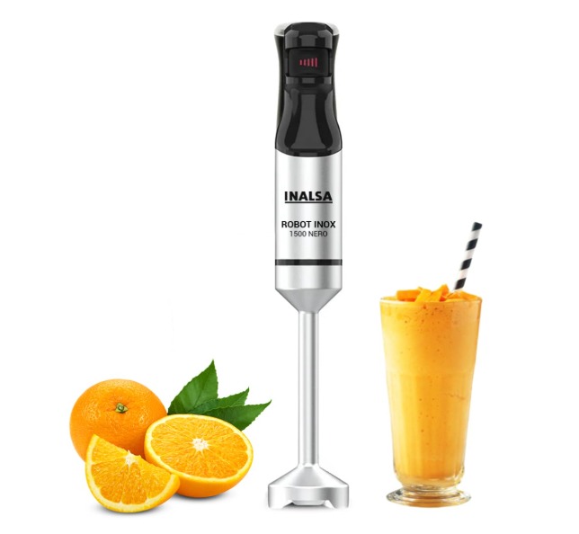 INALSA Hand Blender 1500Watts|Silent DC Copper Motor|Variable Speed with Stepless Technology|Anti-Splash Technology| Detachable Stainless Steel Stem-Robot INOX 1500 Nero