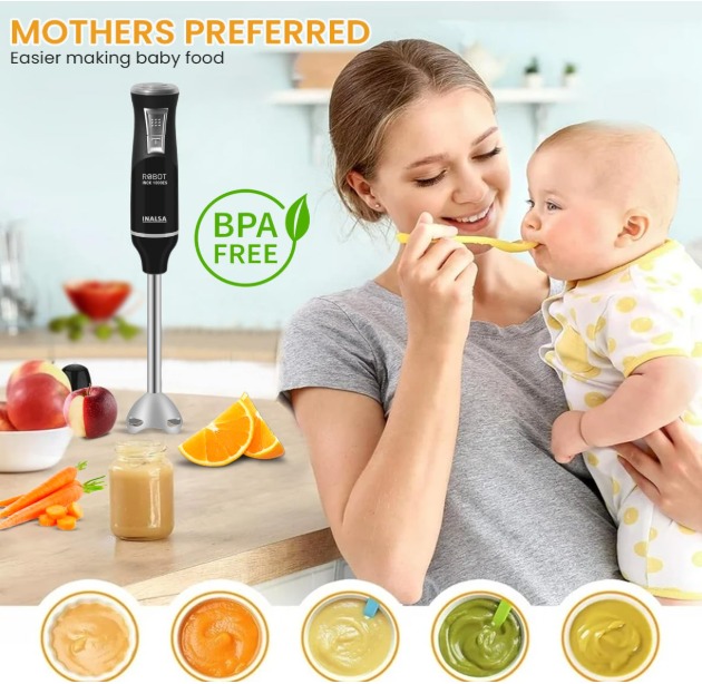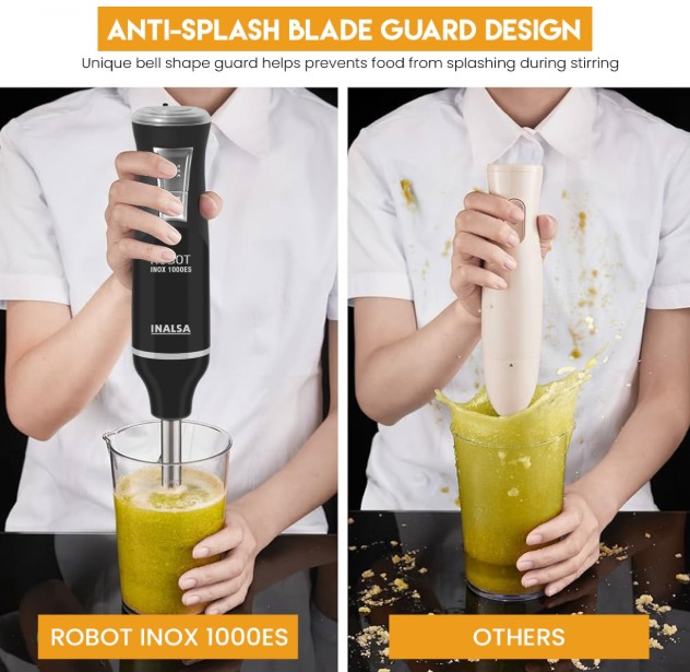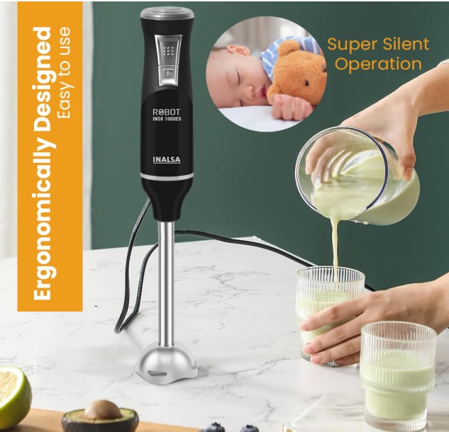 INALSA Hand Blender Mixer 1000W DC Motor Low Noise 20 Speed Control with Turbo Function BPA Free Stainless Steel Rod & Blades Detachable Stem For Cleaning and storage 2 Yr Warranty, Robot Inox 1000ES