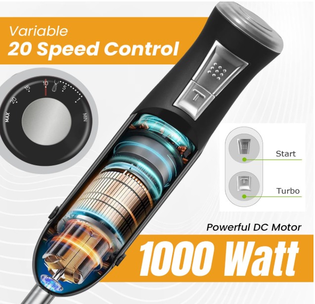 • 20 Variable Speed & Turbo Function: This electric hand blender offers very convenient 20 variable speed and instant turbo function. You can easily adjust the speed to suit different foods and uses The bell-shaped design of the mixing base reduces suction and splashing