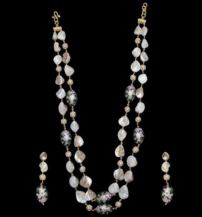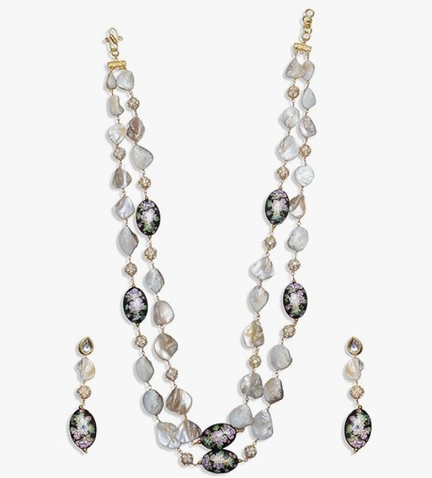 KRySt Radiant Bloom: 2-Line Necklace Set – Mother of Pearls, Golden Diamond Balls, Floral Print Beads with Long Earrings