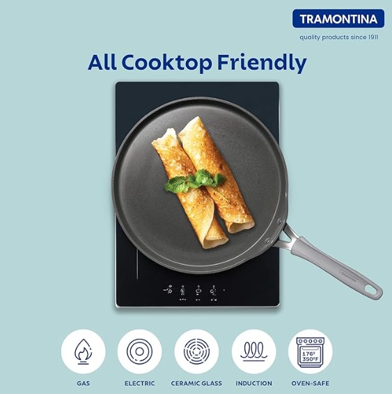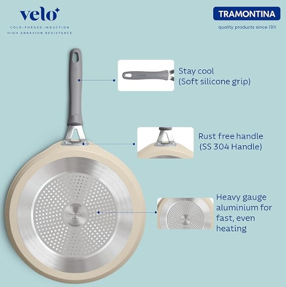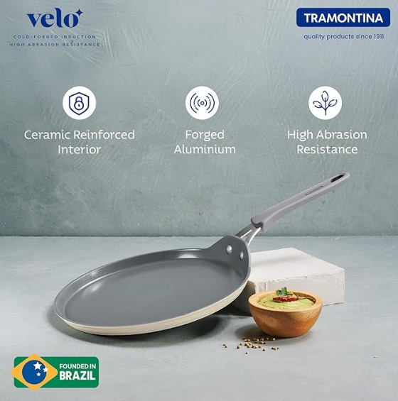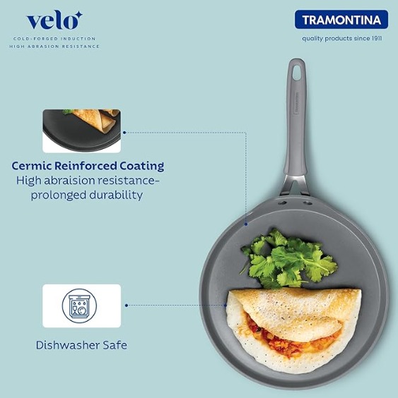 - PREMIUM CERAMIC REINFORCED COATING: This Tramontina VELO dosa tawa features a premium ceramic-reinforced coating for smoother food release and healthier low-oil cooking. Designed for durability, it is abrasion-resistant.