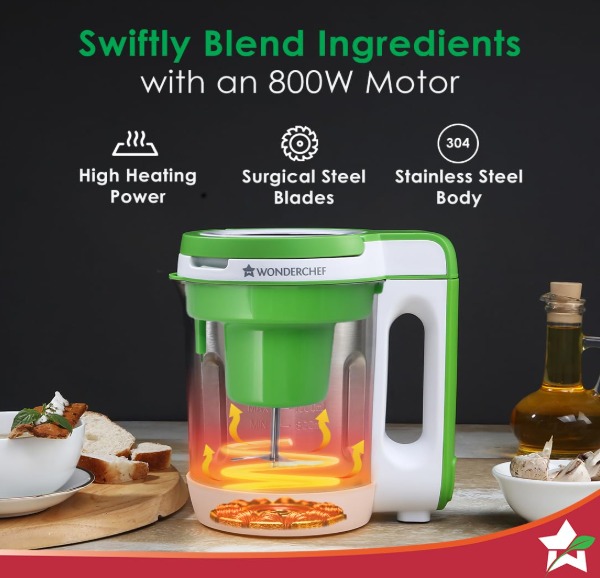 Wonderchef Automatic Soup Maker | 1.0 Litre | 800 Watts Heater | SS Blades & Bowl (Jug) | Soup in just 20 mins | 2 Years Warranty | White, Green & steel