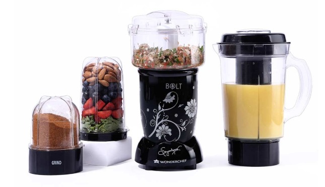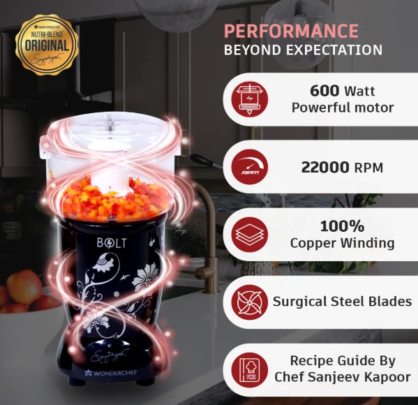 Wonderchef Nutri-blend BOLT Complete Kitchen Machine|600W Powerful100% Full Copper Motor|4 unbreakable jars with Sipper lid|2 Years warranty|Recipe book by Chef Sanjeev Kapoor|Black