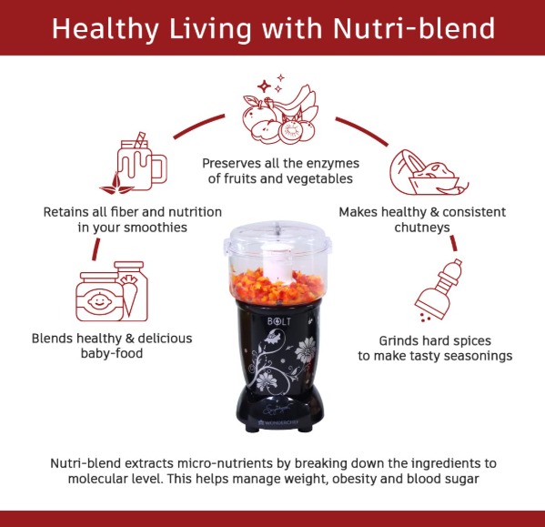 - Performance with Style & 50% Extra Power : Nutri-blend is India’s best-selling mixer-grinder-blender thanks to its powerful motor, beautiful looks, unbreakable transparent jars and awesome performance. And now with Nutri-blend BOLT – Complete Kitchen Machine (CKM), you have 50% extra power, 600W large sized motor and even better results. Due to its compact frame, the power to weight ratio is so favorable that it delivers a performance equivalent to a normal mixer-grinder of 1000W